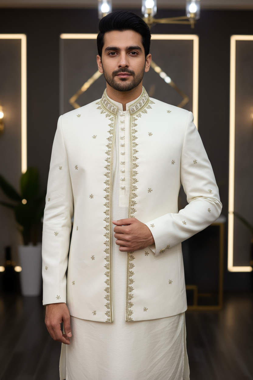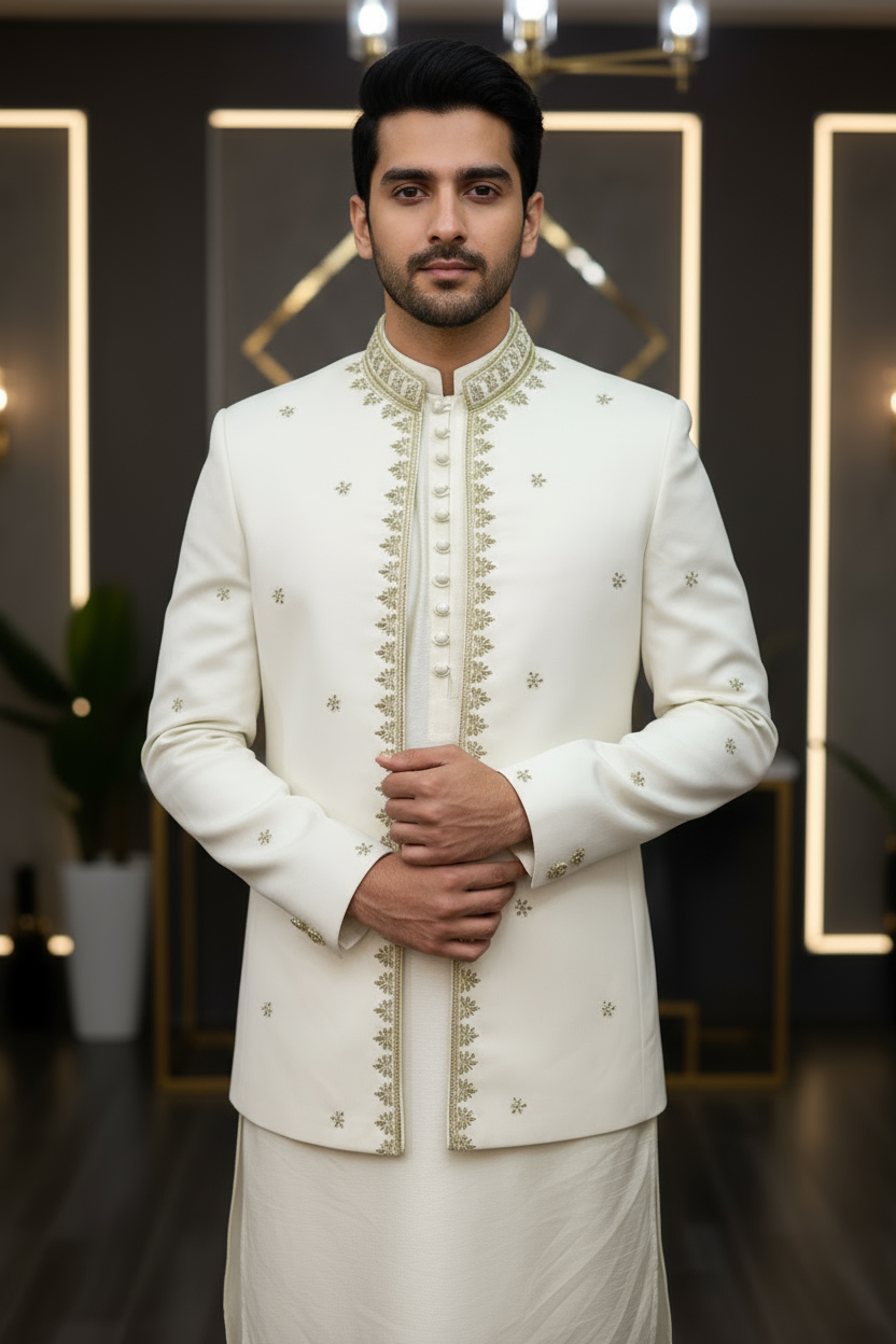 This off-white open prince coat is a premium winter product, perfect for adding a touch of elegance to your formal and semi-formal outfits. Crafted from high-quality, warm fabric, it provides excellent protection against the cold while ensuring a sleek, stylish look. The coat features a front-open design with a broad lapel collar and a slim-fit cut, giving it a modern yet traditional appeal. Its off-white color adds a sense of sophistication, making it ideal for pairing with shalwar qameez, kurta pajama, or even western wear. Perfect for weddings, festive events, and formal gatherings, this open prince coat combines warmth, style, and grace, ensuring you make a bold fashion statement during the winter season.